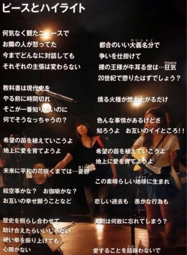 岩松 長島結 Twitter પર サザンほどのビッグネームがピースとハイライトのこの歌詞を昨年のうちに書いていたの あらためてすごいとおもう Http T Co P4dmdzu8ag